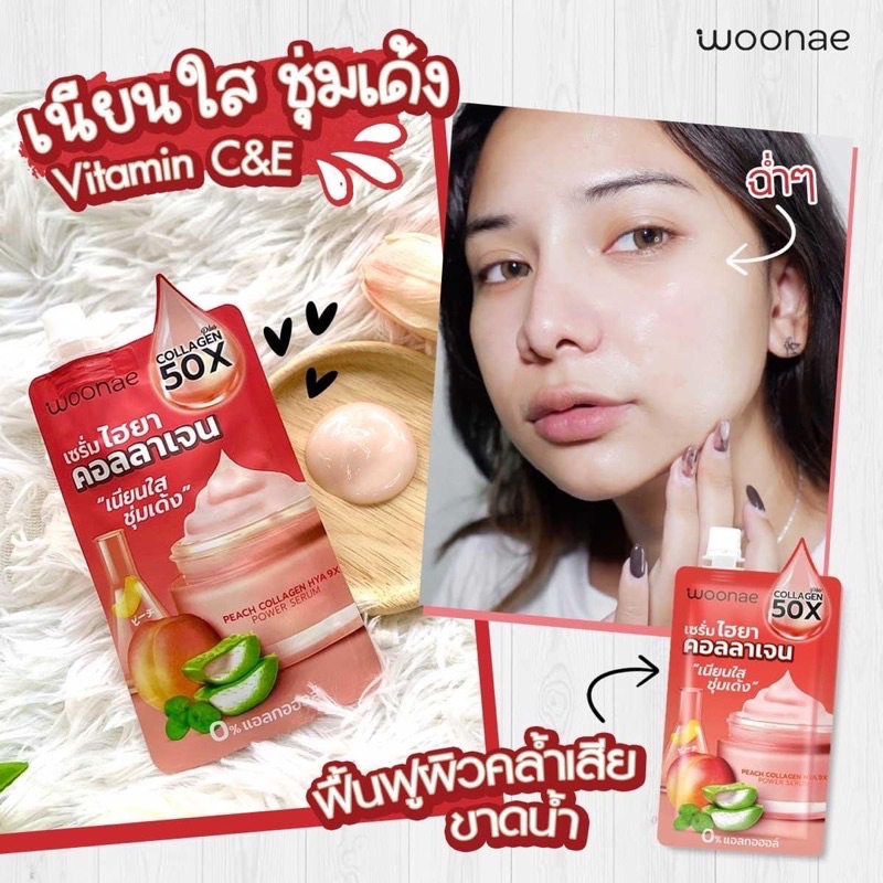 Woonae วูเน่ พีช คอลลาเจน ไฮยา9X พาวเวอร์ เซรั่ม 50กรัม (1กล่อง 6ซอง)