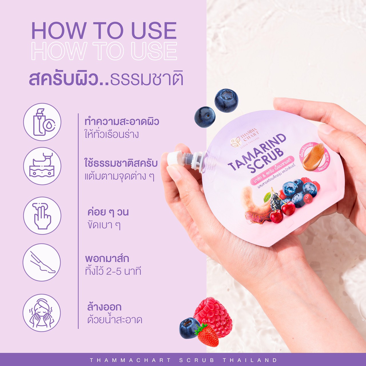 วิธีใช้ : ลงสครับบนผิวหมาด ขัด 3-5 นาทีและพอกทิ้งไว้