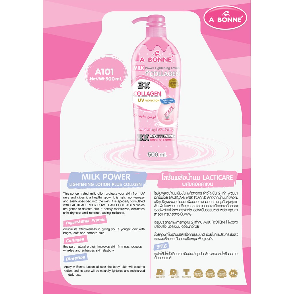 วิธีใช้: ทา A BONNE Milk Lotion ทั่วร่างกาย ผิวจะกระจ่างใสและสีผิวจะสว่างขึ้น