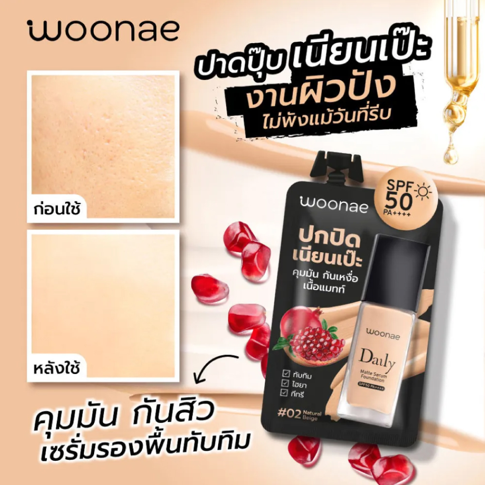 Woonae Daily Matte Serum Foundation วูเน่ รองพื้นเนื้อแมตท์ SPF50 PA++++ #02 8กรัม (1กล่อง*6)