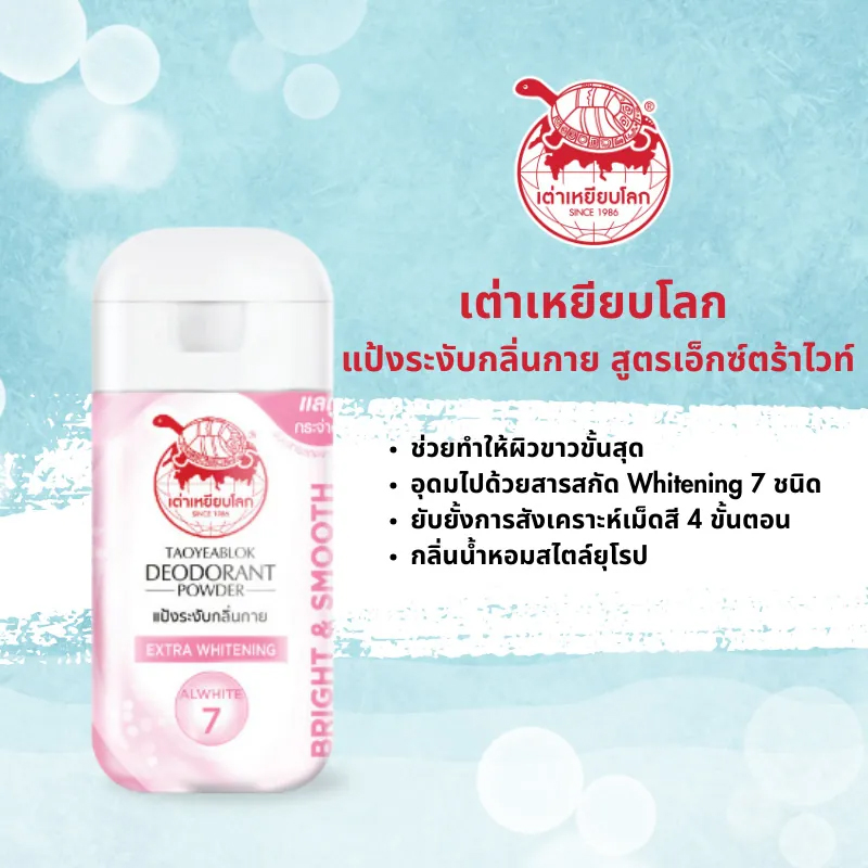 แป้งทาระงับกลิ่น ตราเต่าเหยียบโลก สูตร เอ็กซ์ตร้าไวท์เทนนิ่ง สีขาว-ชมพู 25g.
