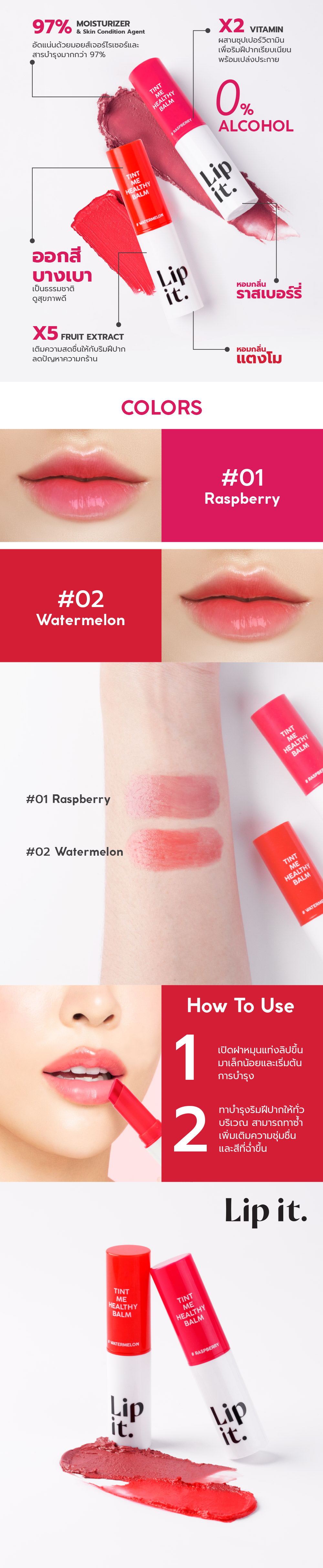 ลิปอิท ทินท์ มี เฮลธ์ตี้ บาล์ม ช่วยมอบการบำรุงพร้อมเติมริมฝีปากสดใสแลดูสุขภาพดีได้ในหนึ่งเดียว เนื้อบาล์มอัดแน่นด้วยสารสกัดช่วยบำรุงริมฝีปากชุ่มชื่น มีวิตามินซีและวิตามินอี มอบริมฝีปากเนียนนุ่มพร้อมดูแลริมฝีปากกระจ่างใส และสารสกัดจาก AHA ช่วยผลัดริมฝีปากคล้ำและเติมความเรียบเนียน ผสานด้วยสารสกัดจากบีทรูท มีส่วนช่วยให้ริมฝีปากแลดูกระจ่างใสเป็นธรรมชาติ และเซราไมด์ มอบการฟื้นฟูริมฝีปากแลดูสุขภาพดียิ่งขึ้น ด้วยกลิ่นหอมสดชื่นจากผลไม้และสารสกัดจากเบอร์รี่หลากชนิด เช่น ราสเบอร์รี่ อาซาอิเบอร์รี่ และแครนเบอร์รี่ ช่วยปลุกความสดชื่นให้ริมฝีปาก มอบความรู้สึกดีทุกครั้งที่ได้รับการบำรุง
